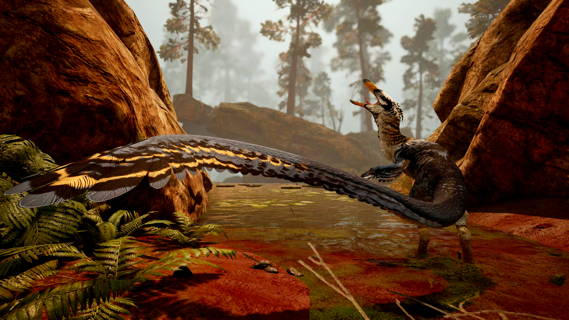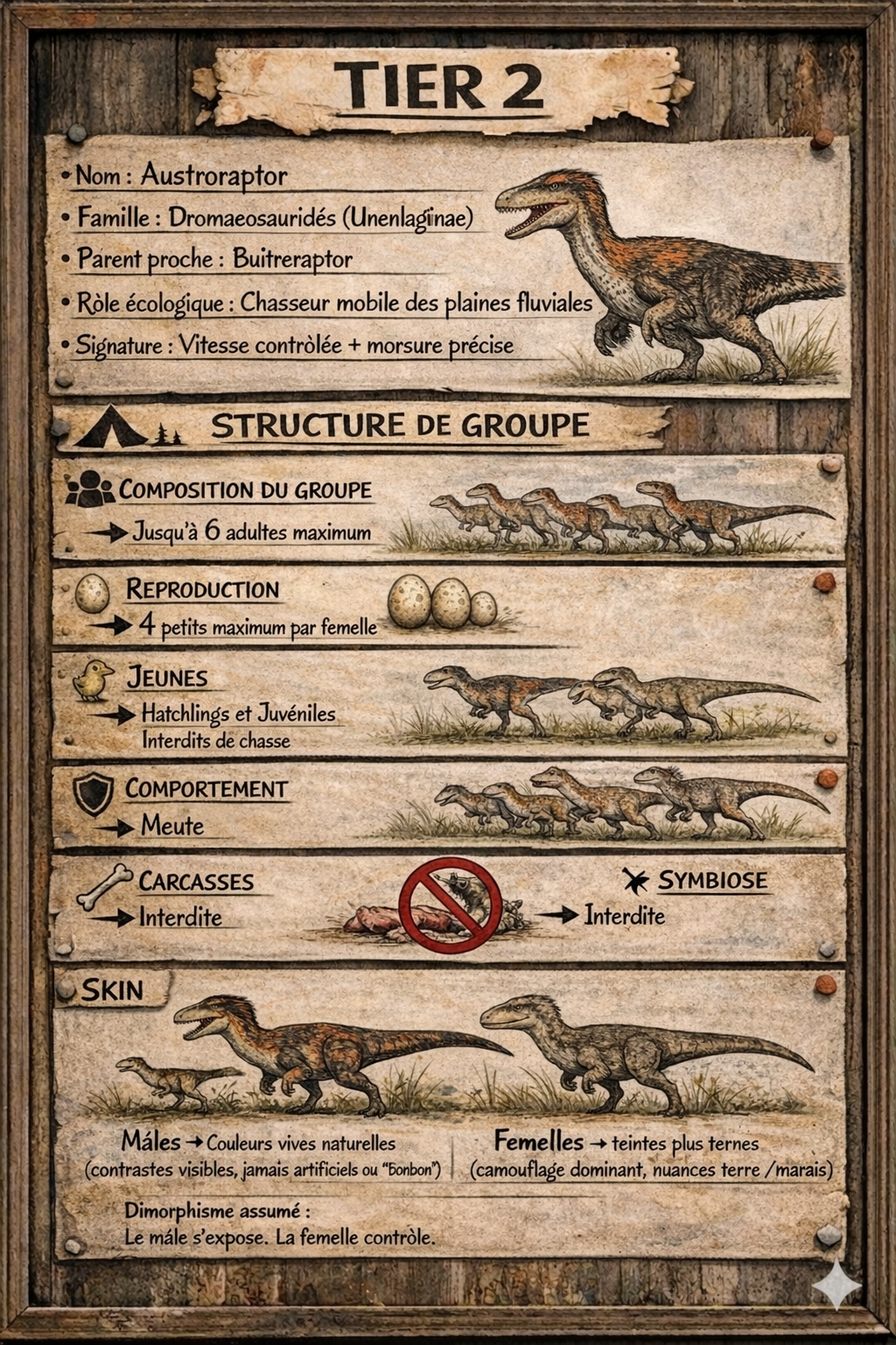 Là où l'eau épouse la terre, là où les marées redessinent le monde deux fois par jour, une silhouette patiente dans le silence des roseaux. On pourrait croire à un simple reflet. Une ombre allongée entre deux vaguelettes. Un battement à la surface… puis plus rien. C'est l'Austroraptor. Il ne règne ni sur la plaine, ni sur la forêt. Il appartient à la frontière. À cette ligne fragile où la terre cède et où l'eau commence. On les appelle les Veilleurs des Rives. Leur posture est basse, souple, presque fluide. Leurs membres longs effleurent la vase sans bruit. Leur regard, lui, scrute la surface avec une précision implacable. Chaque frémissement, chaque éclat d'écaille sous l'eau devient une promesse. Ils ne poursuivent pas longtemps. Ils ne rugissent pas. Ils attendent. Un instant suspendu. Un éclat argenté sous la lumière. Puis la frappe — rapide, sèche, précise. Leur mâchoire claque comme une trappe. Leur corps pivote déjà vers la berge. Et l'eau retrouve son calme comme si rien ne s'était passé. Mais l'Austroraptor n'est pas qu'un chasseur solitaire. Aux premières lueurs ou dans les brumes du matin, plusieurs silhouettes peuvent se tenir espacées le long d'un estuaire, formant une ligne invisible. Ils veillent. Ils partagent le territoire sans bruit, liés par une compréhension tacite. Ils connaissent les marées. Ils lisent les courants. Ils sentent la pluie avant qu'elle ne tombe. Quand le vent souffle depuis le large et que la surface devient trouble, c'est souvent à ce moment qu'ils se mettent en mouvement. Car sur les rives changeantes de Primalis, quand l'eau semble paisible, les Veilleurs observent déjà.