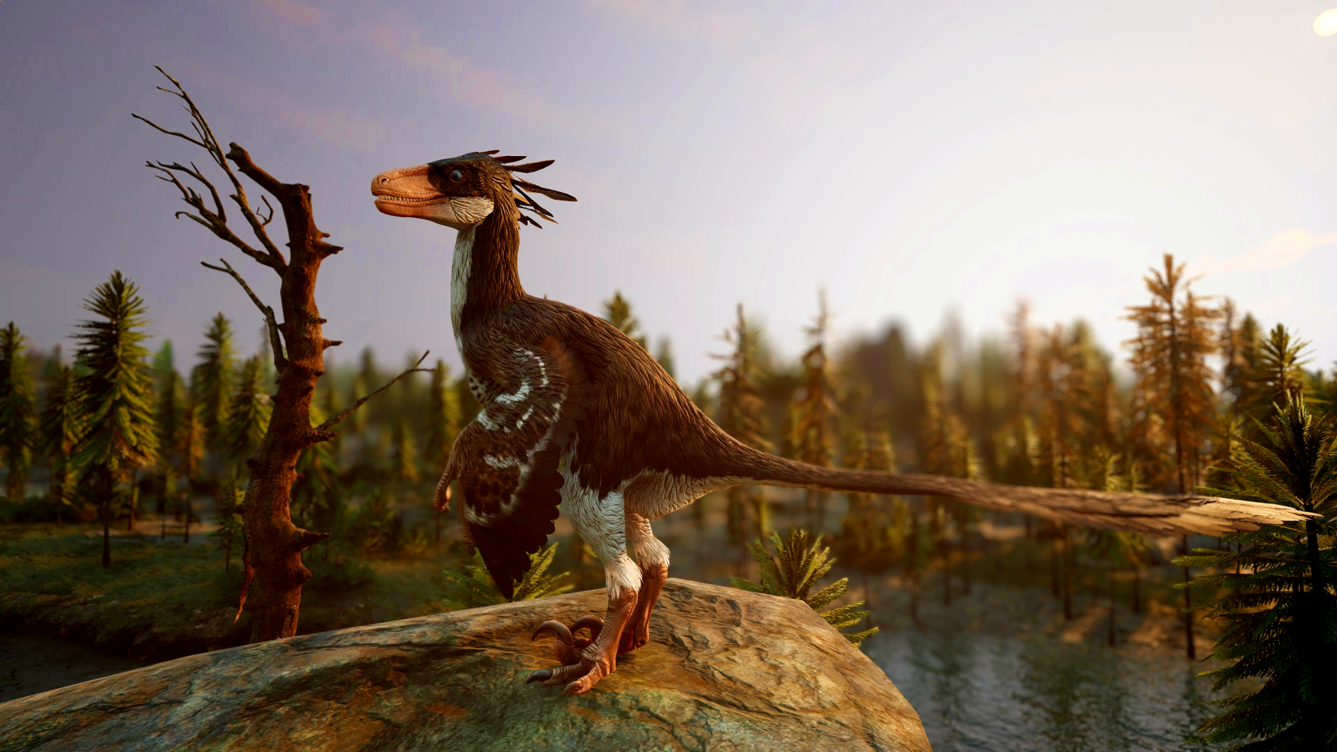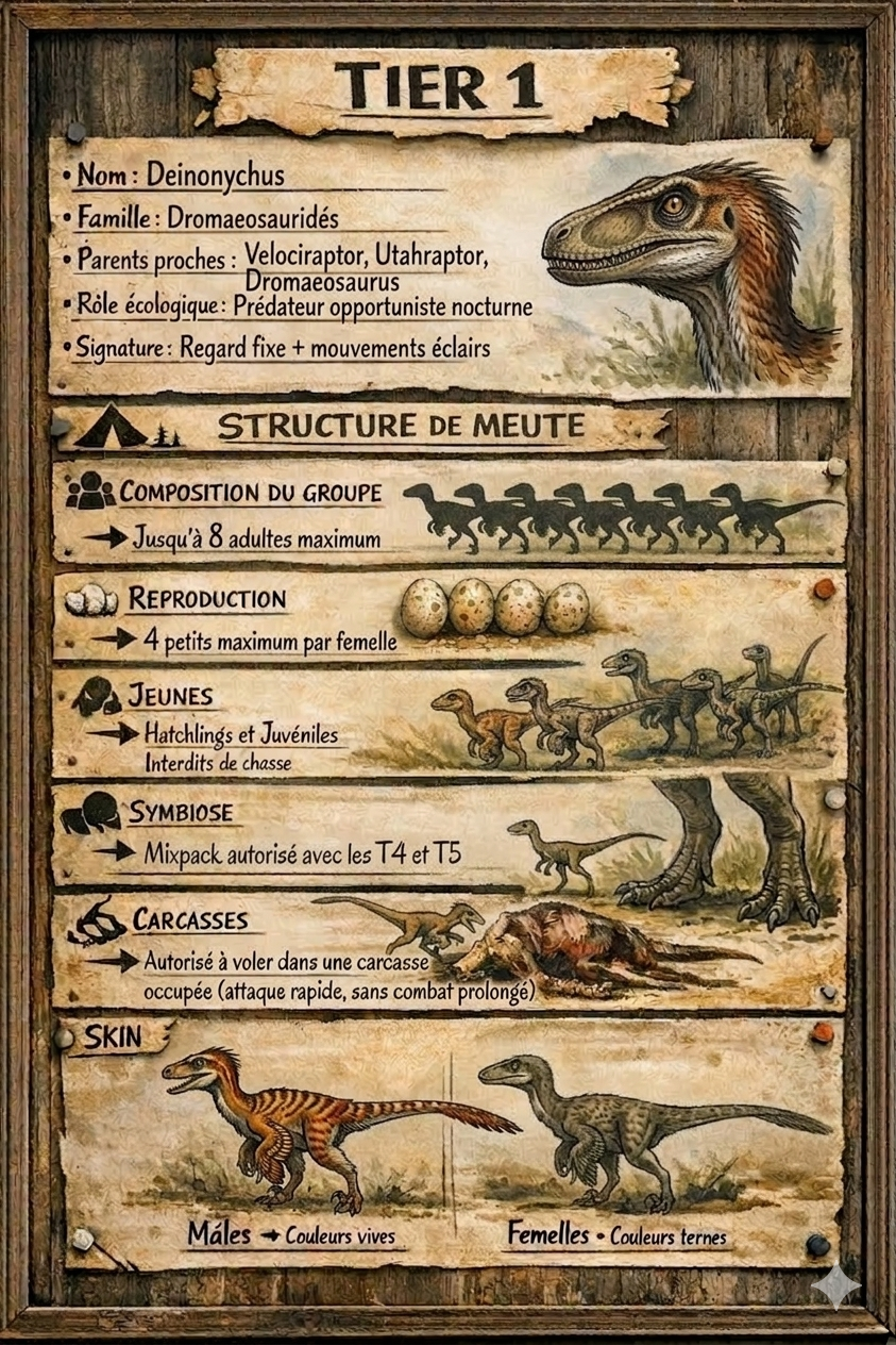 Le vent souffle plus fort désormais sur certaines plaines de Primalis. La terre sèche s'effrite sous les pas. La poussière s'élève en volutes légères, tourbillonne… puis retombe. Mais parfois, elle ne retombe pas tout de suite. Elle danse. Au cœur de ces nuages mouvants surgissent des silhouettes rapides, plumes hérissées, regards fixés sur une cible invisible pour quiconque n'est pas déjà traqué. Le Deinonychus est arrivé. Et il ne chasse pas seul. Leur approche n'est pas un assaut brutal. C'est une mise en scène millimétrée. Un individu avance. Un autre contourne. Un troisième déclenche la fuite. La poussière masque les trajectoires, brouille la vision, dissimule les intentions. Chaque bond soulève le sol. Chaque pivot redessine l'espace. Leurs griffes en faucille ne frappent pas au hasard : elles s'abattent au moment exact où l'équilibre se rompt. C'est là que le lore prend vie. « Les Danseurs de Poussière » ne sont pas seulement rapides. Ils transforment le champ de chasse en scène mouvante. Le vent devient leur complice. Le sol devient leur rideau. La proie devient le centre d'une chorégraphie dont elle ignore les pas. Sur Primalis, certains dominent par la masse. D'autres par la patience. Eux dominent par le mouvement. On ne voit d'abord qu'un tourbillon. Puis un cri. Puis le silence. Et lorsque la poussière retombe enfin, les traces laissées au sol racontent une histoire brève… celle d'une danse parfaitement exécutée.