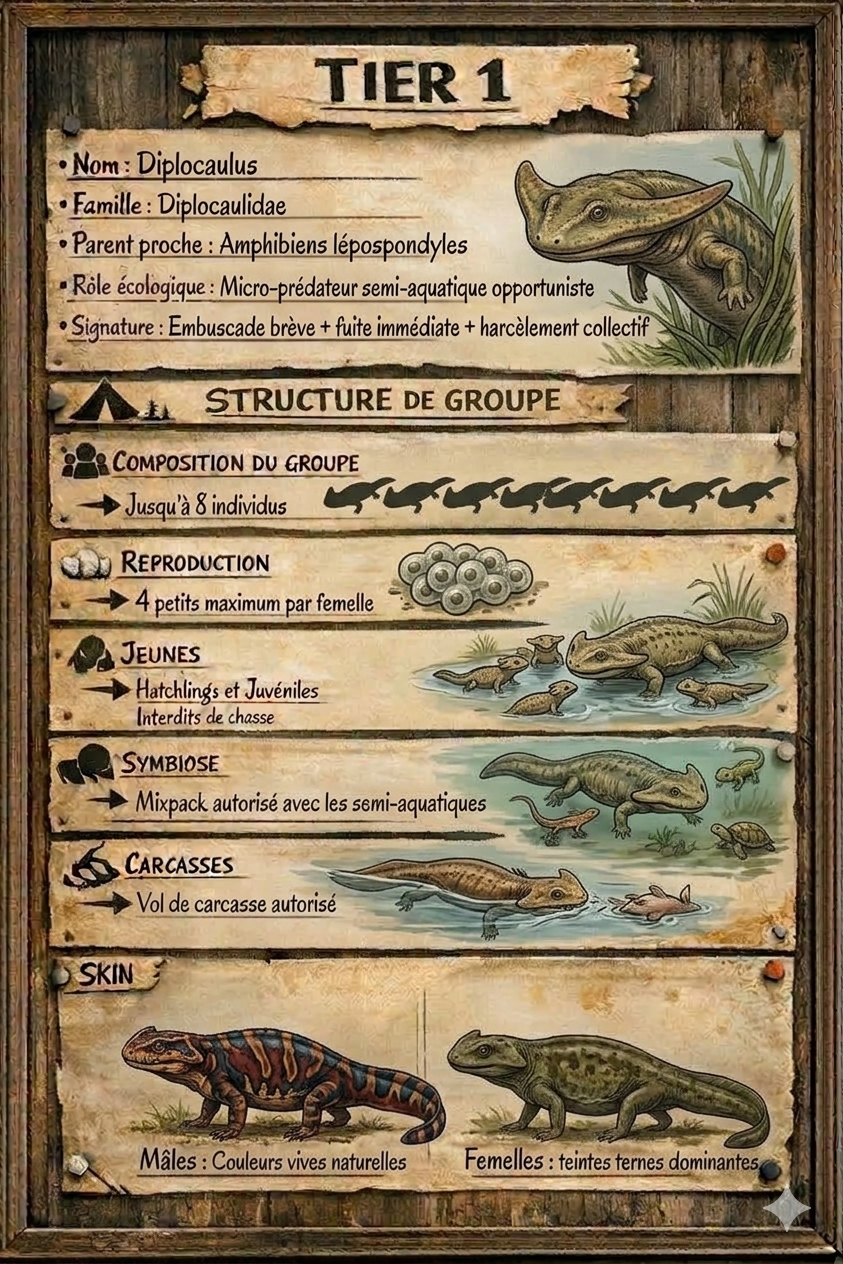 Lorsque la nuit s'installe sur Primalis et que la surface des lacs devient lisse comme du verre, un croissant semble flotter sous l'eau. Ce n'est pas la lune. C'est une tête en forme de demi-lune, fendant silencieusement les eaux calmes. Le Diplocaulus est arrivé. Ni géant, ni conquérant, il ne revendique rien par la force. Il glisse. Il dérive. Il épouse les courants laissés par la marée qui s'est retirée. Dans les étangs isolés, les bras d'eau oubliés et les marécages encore tièdes, il trouve un refuge naturel. Son étrange crâne en forme de boomerang n'est pas une bizarrerie. C'est une clé. Une clé pour se stabiliser dans les eaux agitées. Une clé pour dévier les prédateurs trop pressés. Une clé pour disparaître presque instantanément sous la surface. « Les Enfants du Croissant silencieux » ne portent pas ce nom par hasard. Le croissant, c'est leur silhouette. Silencieux, c'est leur monde. Ils vivent là où les sons se déforment, où les mouvements se propagent en ondes discrètes. Ils ressentent plus qu'ils ne voient. Ils perçoivent les vibrations dans l'eau, les ombres au-dessus d'eux, les changements infimes dans la pression du courant. Pendant que Primalis se reconstruit dans le fracas des pas lourds et des cris territoriaux, eux prospèrent dans le calme. On ne les entend pas venir. On ne les voit qu'un instant. Puis le croissant disparaît. Et l'eau redevient immobile. Comme si rien n'avait jamais troublé sa surface.