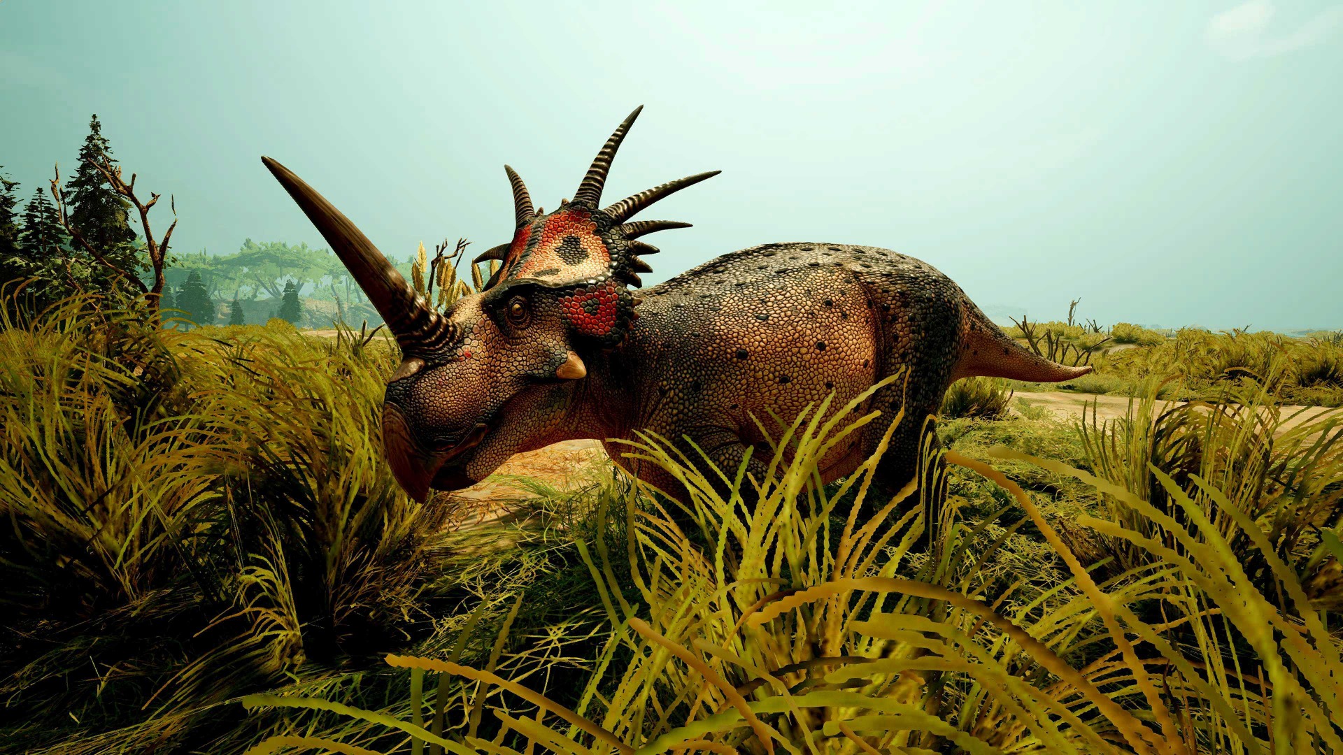 Là où l'Eotriceratops est un rempart, le Styracosaurus est un défi. Il n'attend pas l'impact ; il le provoque. On l'appelle La Couronne qui ne s'incline pas. Il porte sur sa tête un arsenal d'épines qui pointe vers le ciel comme pour défier les dieux de Primalis. Pour lui, la fuite n'est pas une option, c'est une insulte. Son sang est chaud, son tempérament est électrique. Quand il s'installe dans une clairière, il ne partage pas les ressources : il les confisque. Sa défense n'est pas passive. C'est une agression permanente. D'un coup de tête latéral, il peut transformer une simple approche en un massacre de pointes osseuses. Sa couronne n'est pas un ornement royal, c'est une barrière de lances qui interdit l'accès à son espace vital. Il ne courbe jamais l'échine, préférant mourir debout que de céder un pouce de terrain. Sur Primalis, beaucoup survivent par la ruse ou la masse. Lui survit par l'orgueil. Car personne n'a encore trouvé le moyen de briser une couronne qui refuse de plier.